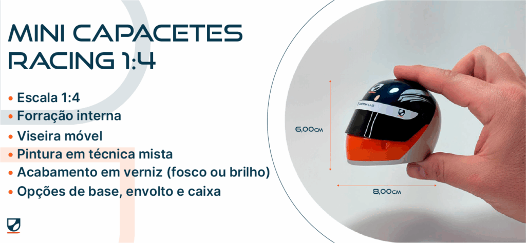 Em infinitas possibilidades, as miniaturas de capacetes são personalizadas conforme as especificações de cada projeto, se tornando assim uma incrível solução de presente para marcas e eventos. São pequenas obras de artes, ideais para ações de marketing, fixação e disseminação da marca e alto valor agregado.